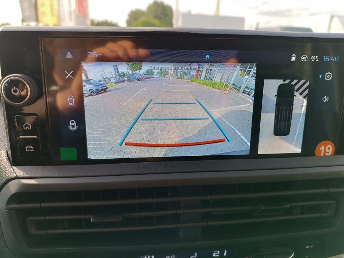 • Pakiet Surround View (IVI MID radio AM/FM/DAB z 10” kolorowym ekranem dotykowym, Mirror Screen (WiFi), komendy głosowe, gniazdo USB typu C, 4 głośniki, łączność 4G przez BSRF: połączenia SOS i Assistance, OTA 4G, wbudowana instrukcja obsługi, oferty usług marki Peugeot, + Wyświetlacz kierowcy 10” cyfrowy, kolorowy + Kamera cofania 180°, wizualizacja na ekranie dotykowym, funkcja widoku panoramicznego + system wykrywania obiektów w martwym polu + czujniki parkowania przód + Flankguard - boczny asystent parkowania, wykrywanie stałych przeszkód + światła przeciwmgłowe + lusterka boczne składane elektrycznie)